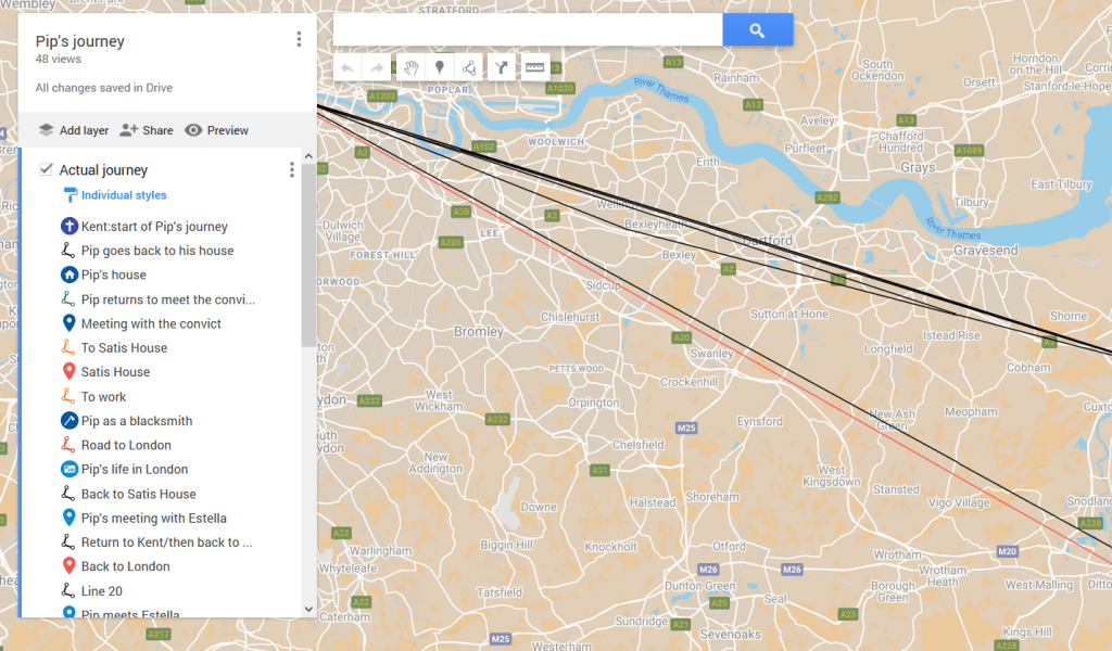 Moving on to the mapping of Charles Dickens’s novel, we proceeded in the following way: we focused first on one layer which illustrates with precision the journey of Pip, Great Expectations’ main character. The other layer focused on the level of corruption of Pip by money. We chose this aspect as our second layer since it related well to one of our main research questions of the project: how money influences the morality of people who possess it. In our map, the color red indicates a high level of corruption by money while the green color represents an almost absence of corruption by money and the gradation of colors in between indicate intermediate levels of corruption by money. Also, we were able to describe some of the emotions felt by Pip at different stages of the story in the same layer. Mapping Great Expectations helped us focus much more on the settings of the story. While we only viewed Kent and London as mere places in the story, we started noticing the contrast between both of them. Kent is where Pip starts out in a poor family but when he receives a fortune form an anonymous source, he travels to London which is where he manifests his acquired wealth. On the other hand, we also noticed that Satis House is where we encounter the main problem of the story, and also where it ends. Further, we were able to observe the level of corruption of Pip by money as he moves from one location to the other. It is at its highest once he gets to London and it is seen in the attitude he adopts with Joe when he later meets him again in the story. It is worth noting that Pip’s level of corruption by money increases throughout the novel up to a certain level and then goes back down. An interesting point is that Pip’s level of corruption by money starts to increase once he meets Estella at Satis House and almost ends when he meets her again at Satis House at the end of the novel. In addition, mapping the text made it look more ‘’true’’ than when it is read since we describe the events and mark them as locations on the atlas, giving the impression that the story really happened.