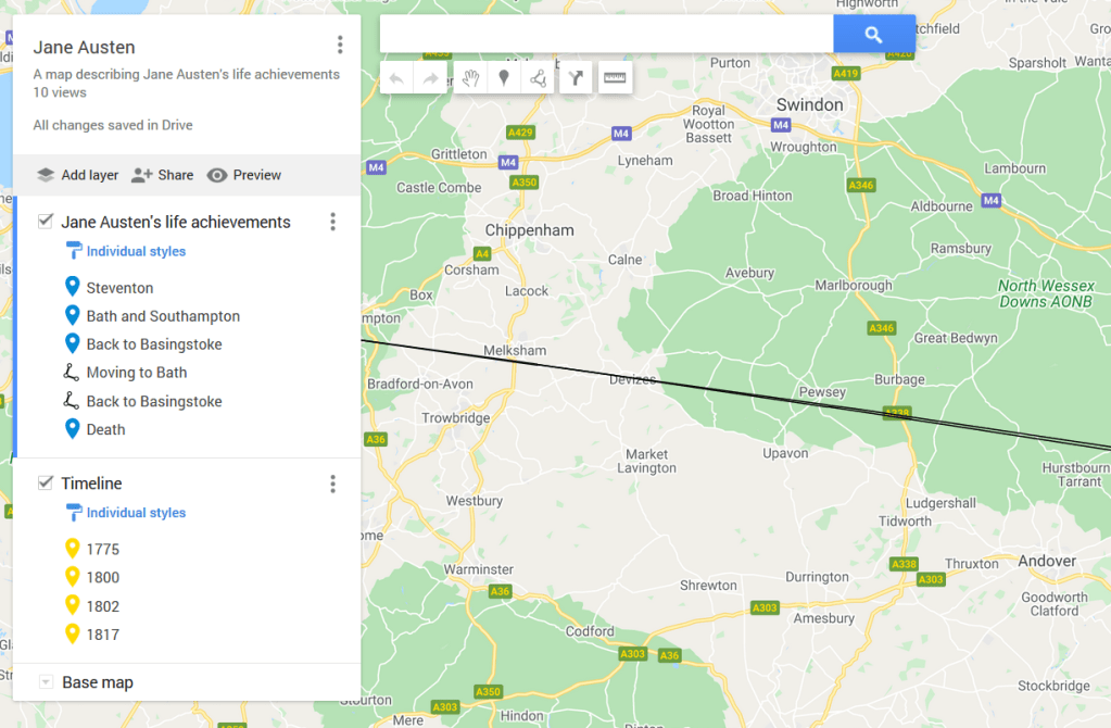 Although life has been much of a whirlwind lately, what the digital world has had to offer has been remarkable in terms of the positive impact it has made. This week, we learned a tool that helps us map a text. What does mapping a text mean you may ask? Simply, mapping a literature text means visually putting all distinctive locations of that text on a map. While there are so many tools to map a novel, we focused on using Googlemymaps. In this blog we will discuss our journey to map the life achievements of three authors; Charles Dickens, Jane Austin, Edith Wharton, and their novels Great Expectations, Pride and Prejudice and The House of mirth, respectively.