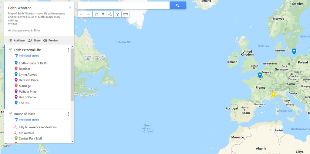 Exploring GoogleMyMaps has been a very positive experience overall. To begin with, the tutorial on YouTube was extremely helpful. In just fifteen minutes it explained to us almost all there is to know about this tool, starting from how to name our first layer to how to draw roads between two different markers. In addition, My maps is user friendly and customizable, where you can add photos, change markers and icons, and navigate through colors. We did not encounter many inconveniences, although drawing a road between two locations was a bit tiresome when the locations were far apart. However, the hard part was not using Mymaps, but rather gathering the information needed to map as websites did not offer enough details. Moreover, regarding the life achievements of the authors, you can rarely find the specific location of where something happened. Achievements are more often referred to by dates instead of places i.e. if someone won an Oscar, the websites states when he won it and what for, but not on which stage he received the prize.