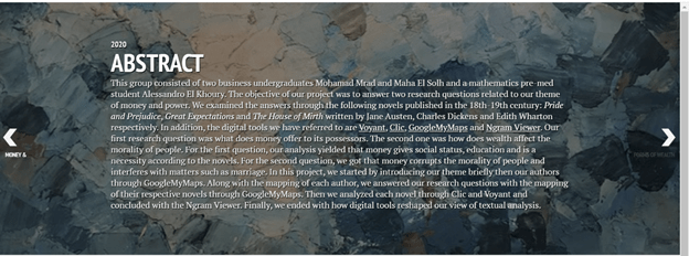 The digital tools we referred to were extremely helpful in building our analysis. GoogleMyMaps showed us that great writers may fabricate fictional stories. However, they use settings and emotions derived from real surroundings. Clic and Voyant pointed to us keywords in the novels related to our theme as well as quotes that allowed us to answer our research questions. The Ngram Viewer was also helpful as it drew to us the correlation between the words ‘’money’’ and ‘’power’’ throughout the 18th and 19th centuries. Furthermore, the platform of our project, TimelineJS, organized all our information and visuals into one place with style and clarity. TimelineJS is divided into slides and a time axis which allowed us to partition our work into well-defined categories. Thus, the digital tools previously mentioned helped us gather all the information while TimelineJS arranged it into a clear summary of our work.