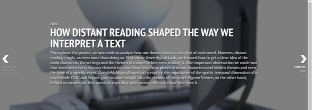 Today is the day, the day we are posting our final blog for this course, our English 256B course. We have come a long way since the beginning of this semester, especially with everything happening in the world from the corona pandemic to a possible economic recession. In this final blog, we will write a reflection on our final DH Project, which by the way if you haven’t seen it, here you go Money & Power. Our reflection will include what we have done and why we chose our theme and our novels, the goals of the project and whether these goals have changed with time and research and most importantly, the new things we have learned about our topic. We will end it by explaining how the digital tools helped us learning along the way. Since this is our last Blog let’s make it worth it.